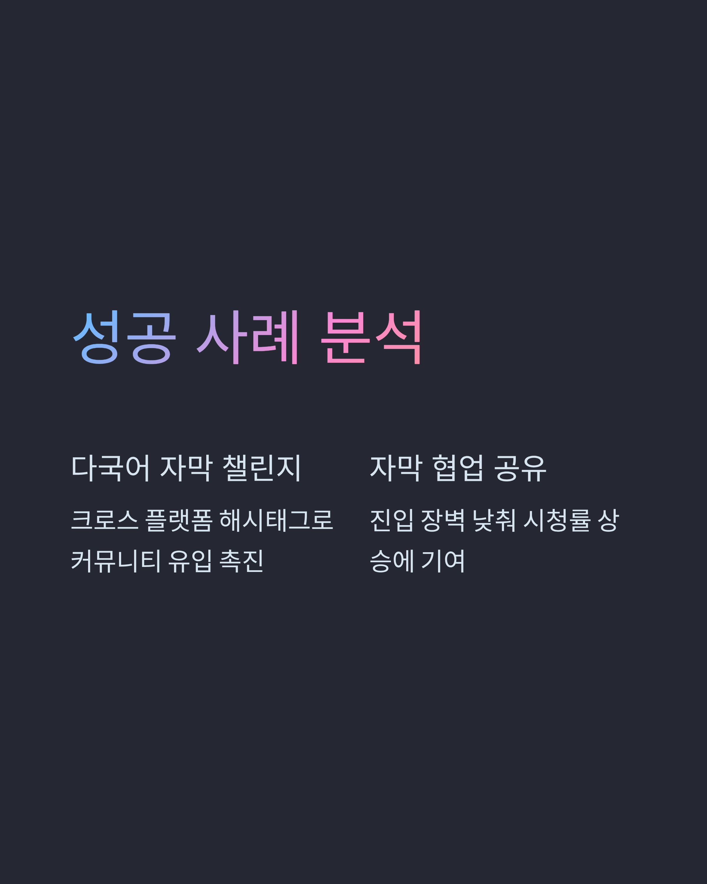 - 번역 자막의 품질이 재생 여부를 좌우합니다. 자막이 매끄러울수록 대사 해석에 따라 호불호가 줄고 확산 속도가 빨라집니다.